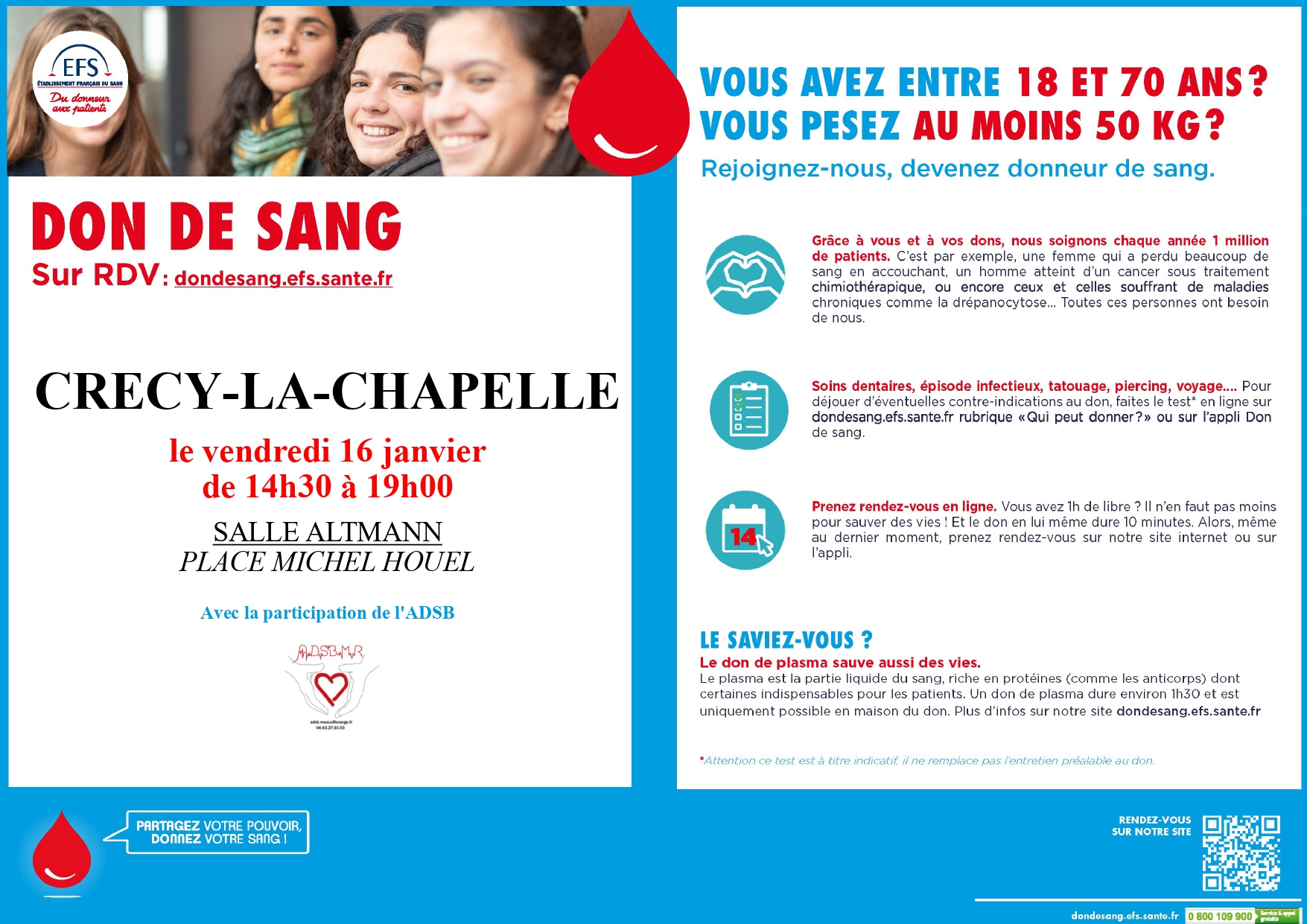 Les bénévoles de l’ADSB de Meaux accueilleront les volontaires au don de sang pendant la collecte organisée par l'Etablissement Français du Sang (EFS).