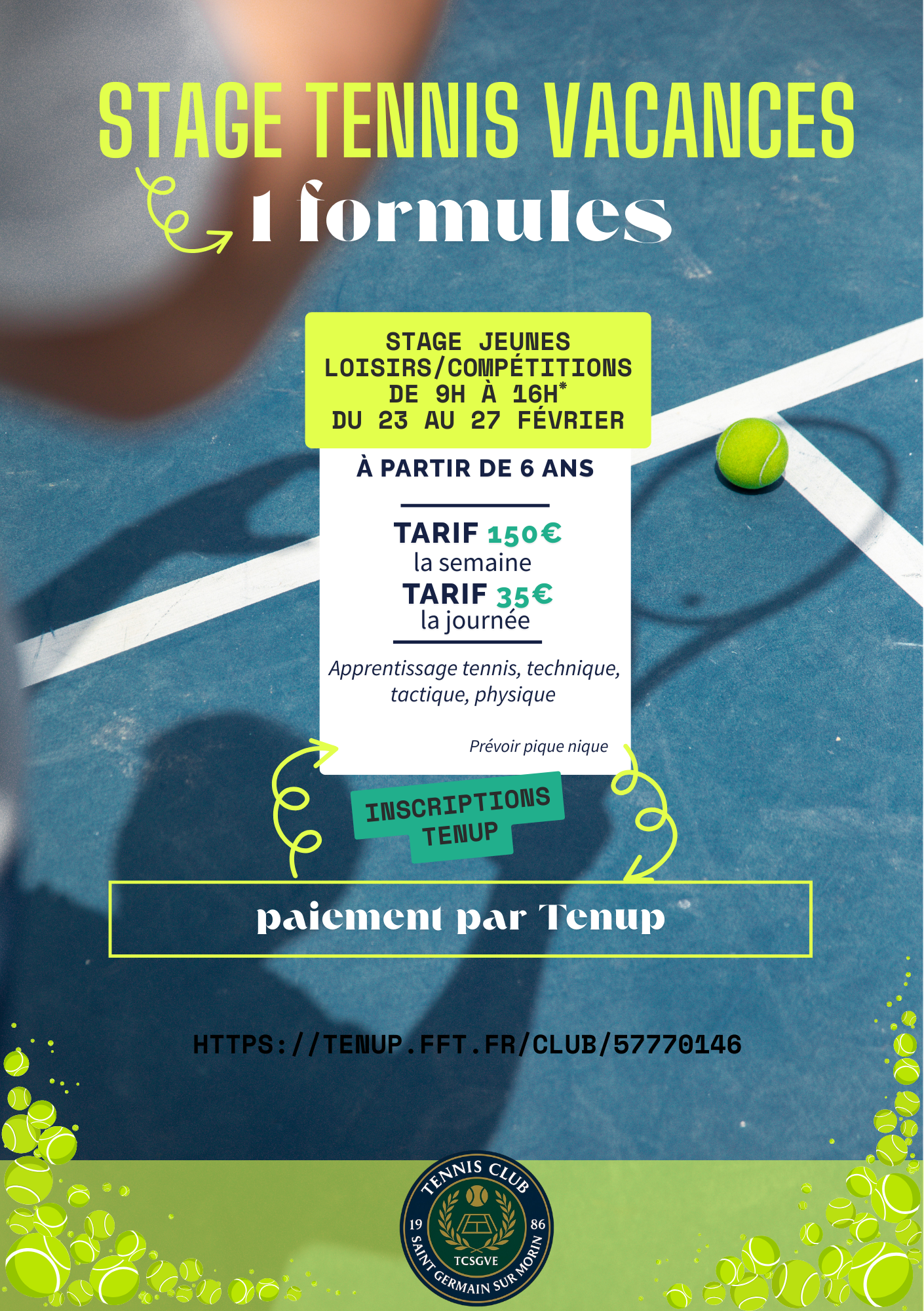 Vous êtes ici : Accueil Découvrir-bouger Animations-festivités Agenda Open de Tennis - stage jeune Open de Tennis - stage jeune L'actualité du Tennis Club de Saint Germain sur Morin Val d’Europe Un stage de tennis pour les jeunes du 23 au 27 février 2026 L'Open de tennis du 23 février au 15 mars 2026 Précédent Suivant