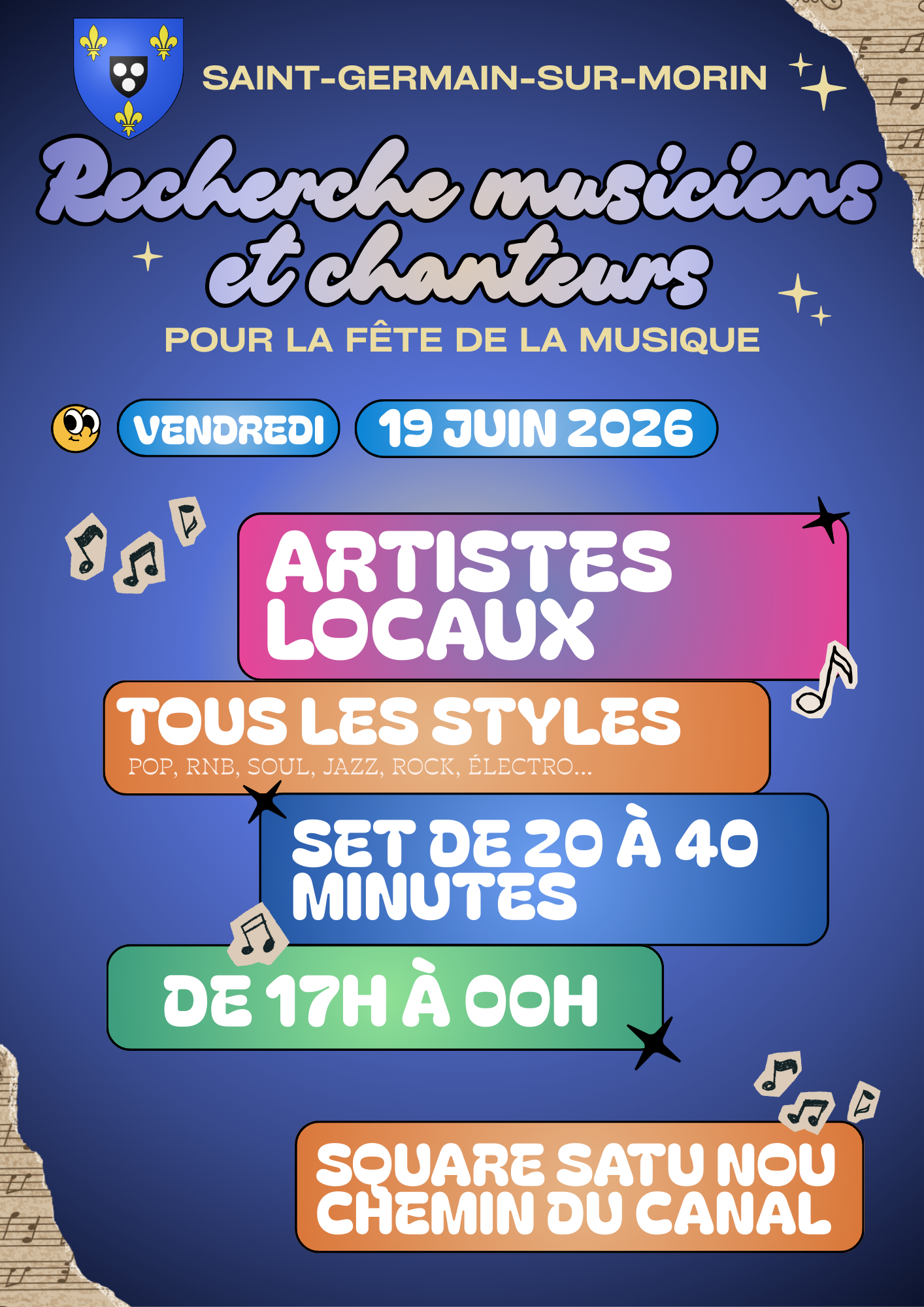 Vous êtes ici : Accueil Découvrir-bouger Animations-festivités Agenda Recherche musiciens pour la fête de la musique Recherche musiciens pour la fête de la musique Précédent Suivant